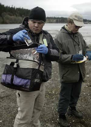 Kitsap County Health District employees Richard Bazzell and Newton Morgan and Jefferson County Public Health employees Alicia Hicklin and Mike Radford comprise the team. All they have to do in return for a day out of the office is find water runoffs that are draining into the bay and fill up test tubes with samples.