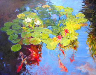 That’s why she’s consistently returned to the garden for inspiration over the years, flirting with the paradox of capturing in a still image that which is never truly still. Her show at Collective Visions this month is a direct representation in its subject matter of mainly water lilies and koi fish, above and below the water surface.