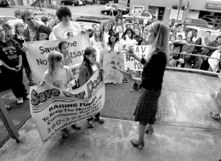 Swim teams, coaches and parents alike chanted “save the pool, save the pool” while posters and placards sported similar messages.