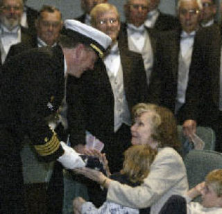 Naval Undersea Warfare Center Division Keyport retiring Capt. Jonathan Dowell presents a flag that was flown over Gettysburg to his mother Virginia Trainor