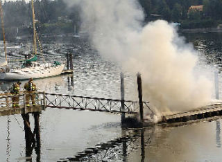 Navy Region Northwest Keyport firefighters joined forces with Poulsbo Fire Department and North Kitsap Fire and Rescue in responding to a waterfront dock fire