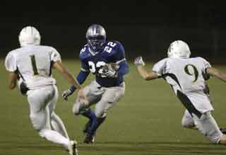 Olympic's Larry Dixon cuts between two Timberline defenders during Oly's 34-20 loss Friday at Silverdale Stadium. Dixon gained 225 yards rushing on 27 carries.