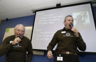 Kitsap Credit Union (KCU) President/CEO Elliot Gregg (right) and Senior Vice President of Marketing Ron Rogerson sing Britney Spears' 'Oops I Did It Again' in front of fellow employees Tuesday morning. KCU employees voted for who they thought could sing the best. The person with the most votes could match that number in money and buy themselves out of singing. The next person in line had the choice of matching the person in front of them and their total or sing. Gregg choose to sing over paying $355 while Rogerson offered his talents as a backup singer. All proceeds were donated to United Way of Kitsap County.