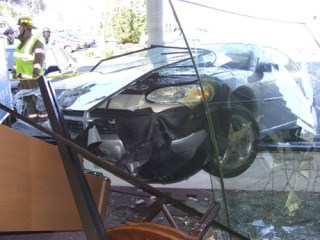 According to a report from the fire department, the woman thought she was putting on her brake when she pushed the accelerator, breaking through a 10- by 10- foot glass window and damaging a display case, some furniture and a small brick wall.