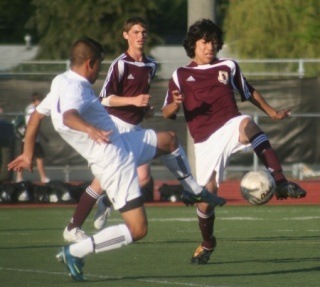 South Kitsap's Diego de la Cruz and Pasco defender converge on the ball during the Wolves 2-1 victory in the Washington State 4A soccer championship match on Saturday night.