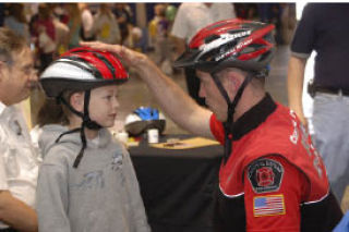 Central Kitsap Fire & Rescue Lt. Greg Platz fits a helmet for a young attendee during Saturday’s event.