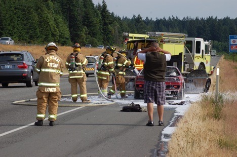Anthony Wilson, a 19-year-old Port Orchard resident, was forced to evacuate his Pontiac Fiero on SR3 just south of the Newberry Hill exit about 9 a.m. June 16 when the engine compartment caught fire.