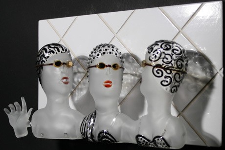 Buhler’s lampworked swimmers — playfully sophisticated statuettes born of pirex glass rods, fashioned in swim caps, goggles and transparently opaque suits — pose at the entrance of the exhibit. Photographer Colleen Meacham’s ‘Scattered Light Series’ — in which the she takes her camera to the pool — provide a fitting backdrop.