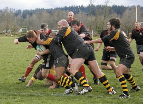 Members of the Kitsap Rugby Football Club (in black and red) play a match last spring.