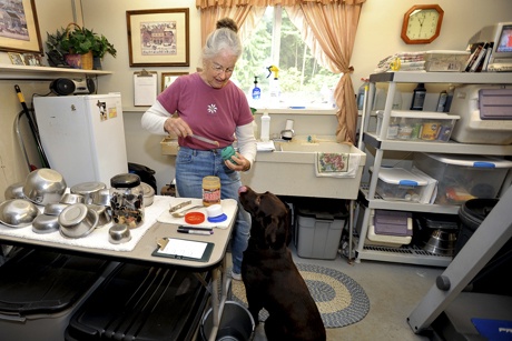 POULSBO — Woody’s chocolate brown eyes beg as he enthusiastically lobbies for a treat. Stacy Thompson complies with the expertise of a caring grandmother, filling a doggy toy with peanut butter. Woody not-so-patiently waits, periodically sticking his snout between the peanut butter jar and the treat.