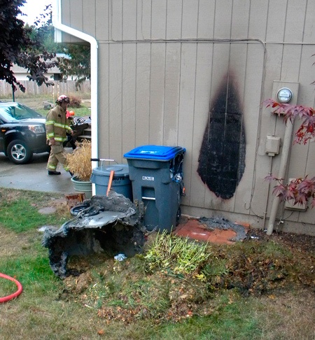 Central Kitsap Fire & Rescue crews leaving the scene of a possible house fire in the area of Athens and Johnson roads in East Bremerton decided to return to the fire station on a back road as part of a neighborhood familiarization drill. Luck factored into the equation when firefighters decided to take a turn down a small road and noticed smoke and flames from a garbage can on the garage-side of a home off Sheffield Court at about 12:50 p.m. Tuesday.