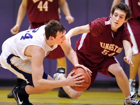 North Kitsap player Brandyn Winkley dives for the ball before Kingston's Ryan Byers can get the steal during a fast action game at North Kitsap Friday night. Kingston beat North 49-42.