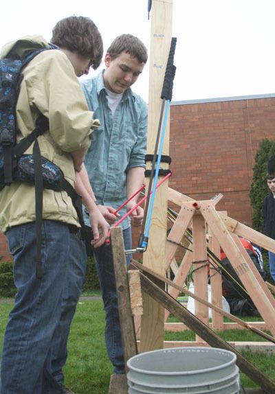 Most of the students built a catapult or the similar trebuchet, but one group chose to build a ballista, which looked like a large, mounted crossbrow.