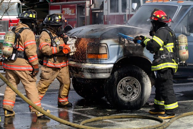 Poulsbo firefighters used a power saw and pry bar to open the truck’s hood, then extinguished a small flame inside the engine compartment. Poulsbo Battalion Chief Bruce Peterson said hood releases burn off quickly in engine fires, so hoods usually have to be forced open.
