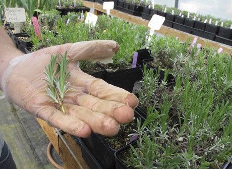 Sepulveda stands in the farm’s green house, where rows of new lavender plants sit — really, where each purply bushel begins. Most are grown from cuttings, and have yet to grow beyond the size of a small porch plant. Each new plant takes a few years to mature, and can produce blooms for nearly two decades. Sepulveda points to large, thick tubing, strung like garland above him, and explains that heat from a fire in the green house is pumped through the tubing and has kept the growing plants warm during winter. The mature plants are lined in rows outdoors, and need little in the way of winter care save for vigilant weeding.
