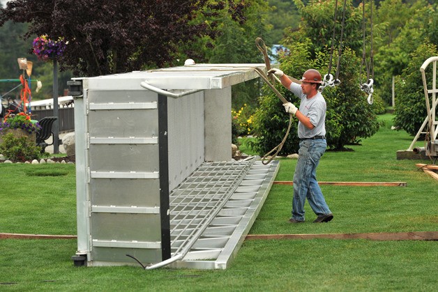 Dock restoration work began in earnest Monday as a contractor used a crane to replace the original steel ramps leading to A, B, C and D docks with new aluminum ramps. Together the four new ramps cost $60,000. Two of the old ramps were given to North Kitsap Trails Association to be used to span ravines in its String of Pearls trail system.