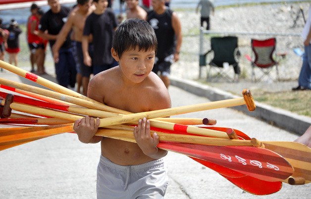 The Lady Esther Geronimo Canoe Club and the Salish Eagle Canoe Club battle for first place in a race Sunday afternoon.