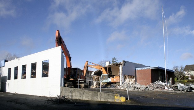 Demolition began on Poulsbo’s 60-year-old North Kitsap Armory on Jensen Way Tuesday afternoon. The Port of Poulsbo, which bought the building last year, will raze the land and install a parking lot.