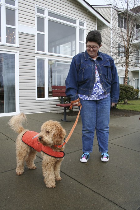 Pami Perry stands outside of her East Bremerton apartment complex Jan. 7 with her service dog Rainbow. Beginning March 15