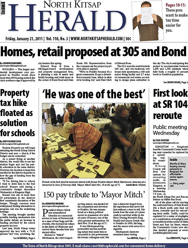 This week’s edition consists of 36 pages and two sections: News, Opinion, Letters, Calendar, Sports, Tax Time: Your Guide to the Tax Season, Business, Legal Notices, Kith & Kin, Scene & Heard, Kitsap Week, Kitsap Classifieds, Real Estate Now, and USA Weekend.