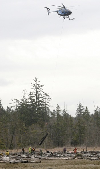 INDIANOLA — A helicopter lifts creosote-treated wood from the Doe-Keg-Wats estuary Tuesday near Camp Indianola.