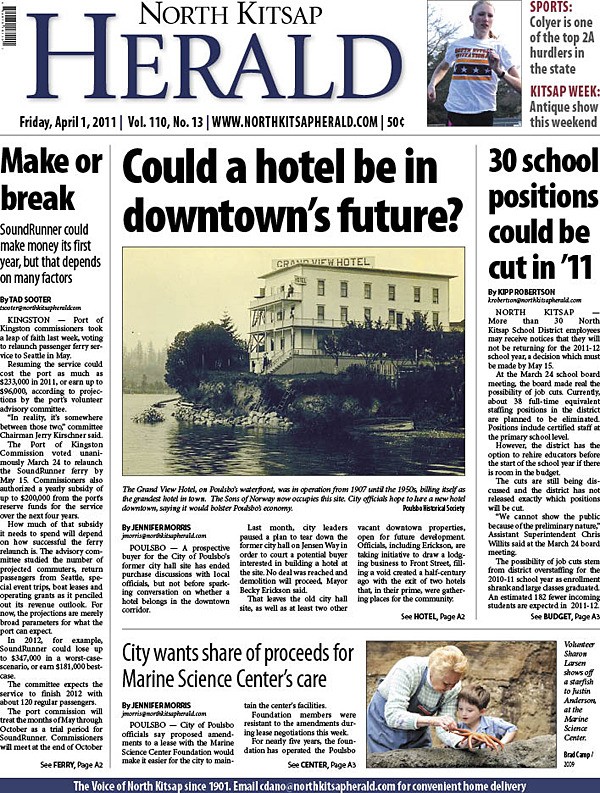 Efforts of Poulsbo city officials to lure a hotel to downtown, the possible elimination of 30 North Kitsap School District positions, SoundRunner’s financial outlook, and possible changes to the Marine Science Center lease are the top stories in the April 1 North Kitsap Herald.