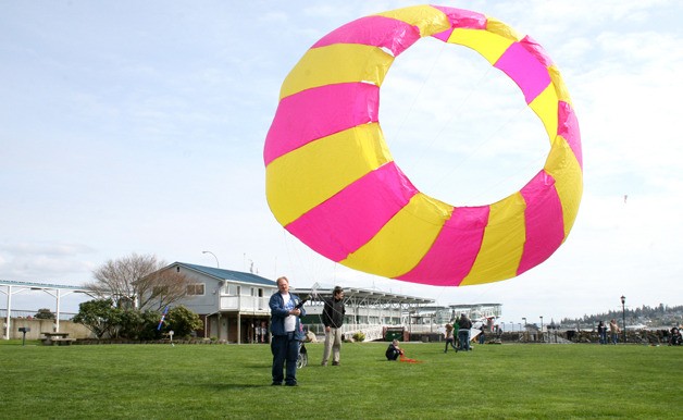 Kites, vendors and music drew nearly to 200 people to Mike Wallace Park, event organizers from Kingston Windermere Real Estate estimated. Rain clouds stayed at bay and a stiff breeze blew in from from Puget Sound. Prizes were given in various categories and a kite parade was held, but the heart of the event was the chaotic free flying on the lawn. Children crisscrossed the park grounds towing miniature kites while another flock of colorful, winged contraptions soared hundreds of feet overhead.