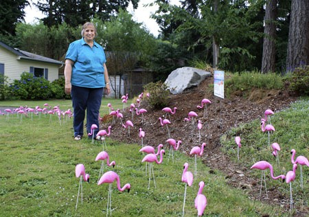 Wharton said the community has responded positively to the fundraiser. They have had requests for “flockings” on Bainbridge Island, Port Orchard and Kingston in addition to Central Kitsap and Bremerton. She compared the act of setting up the flamingos similar to when teenagers toilet paper houses, since they try to do it without getting caught.