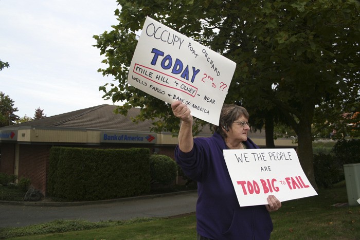 A group of half a dozen sign-waving demonstrators brought a little of the Occupy Wall Street buzz to Port Orchard on Friday.