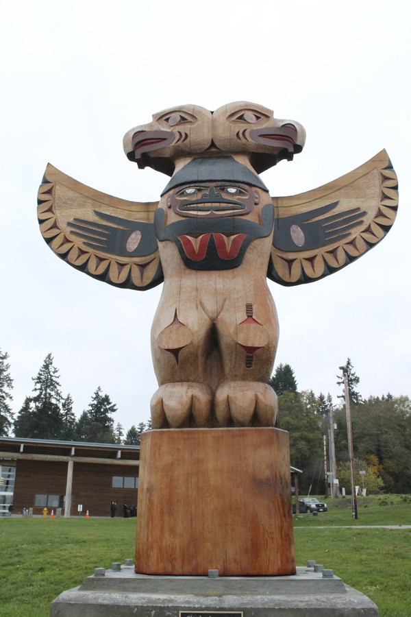 The double-headed eagle pole sits in front of the longhouse, facing Miller Bay. It was raised in 2010 with a blessing, created by five carvers: Michael Pavel (Skokomish), Ed NoiseCat (Shuswap/Stlitlmx), Mark Johns-Coleson (Chehalis), Walter Lewis (Chehalis), and Qwoo-Chee Kah-Ty-Ah Moran-Lawrence (Suquamish).