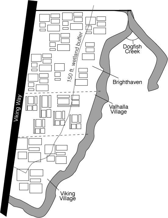 The buffer length has a big effect on the proposed sites. Vikings Landing would include an 18-unit building, three 6-unit condominium buildings, and a single family residence on 6.38 acres. A 150-foot buffer would cut the proposed construction in half. Brighthaven was originally 50 condominium townhouses on 4.6 acres, but wetlands cover about one-fourth of the site, according to the planning department’s staff report. Valhalla Village is 20 single-family detached units on 2.83 acres, but if the original plans expire, the project will be limited to 1.91 acres of development.