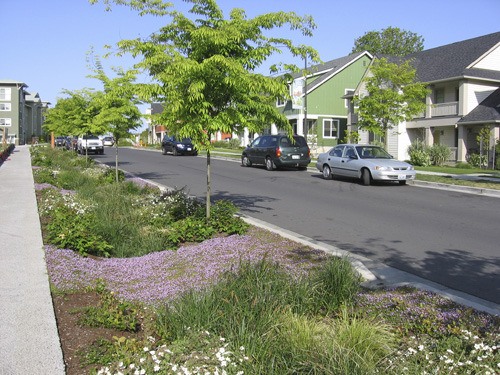 This project will identify places on public property, private property and road right-of-way to manage stormwater on-site in a cleaner, more attractive way. Five areas are being studied: downtown core, 104 Corridor (up to Lindvog Road), Village Green, Eastside, and the Lindvog area. The project team has already identified some candidate sites and has some ideas for their designs. These types of stormwater management structures look more line planters that water retention structures. They allow us to enlist plants in our stormwater management.