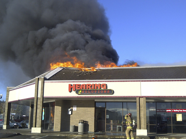 Rebecca Thompson, manager of Hearing Solutions, a business in the complex, was driving through town Sunday when she noticed black smoke filling the sky that seemed to be coming from her business. She made it to the fire in time to watch the roof collapse.