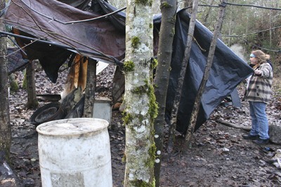 A hidden snow covered trail through the woods off Harlow Way in Bremerton opens to a camp home to at least a dozen homeless men and women.
