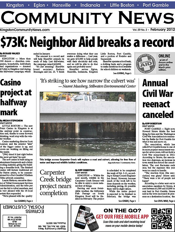 KINGSTON — Neighbor Aid raises $73,846 for ShareNet, a record. The Point Casino project is at the halfway mark. The Carpenter Creek bridge project is nearing completion. Citing costs, the annual Civil War reenactment at Port Gamble is canceled.