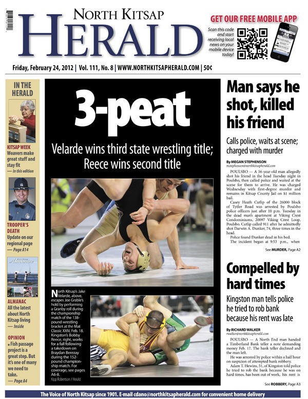 POULSBO — A Poulsbo man allegedly shot his friend in the head, called police and waited at the scene for them to arrive. A Kingston man said he robbed the Timberland Bank in Poulsbo because he’s unemployed, behind in his rent and needs the money. On a happier note, North Kitsap’s Jake Velarde won his third state wrestling title, Kingston’s Bobby Reece won his second.