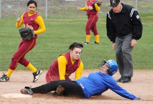 Kingston's Alexa Ekonomakis tags out a North Mason runner at second during a home game March 21. The Buccaneers fastpitch team won 11-1.