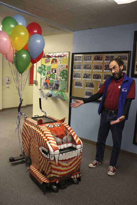 Fang is like his trusty sidekick. The floor scrubber is painted to look like a saber tooth tiger and frequently roams the halls of Brownsville Elementary School with Pat Nicholson.