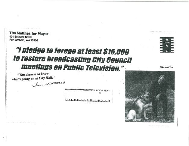 During last year’s contentious campaign, the group Tim Matthes for Mayor sent campaign fliers pledging Matthes would forego at least $15,000 to restore Bremerton Kitsap Access Television (BKAT) to the bi-monthly city council meetings. The fliers pledged $15,000 of his mayoral salary to restore TV access that he said was vital for transparency in government.