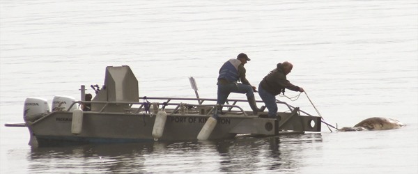 Port of Kingston employees used chain and cinder blocks to sink a previously unsinkable cow carcass off North Beach.