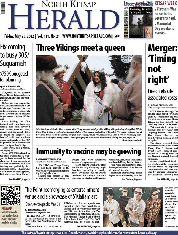 POULSBO — Fire chiefs say timing is not right for merger. A fix is coming to a busy 305/Suquamish Way intersection. Immunity to whooping cough vaccine may be growing. The Point is reemerging as a major entertainment venue and showcase of S’Klallam art.