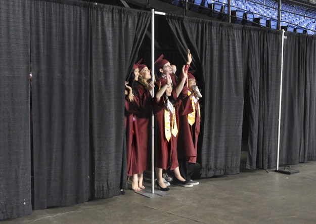 Soon-to-be graduates peer from behind a curtain to see and wave at family and friends gathered in the stands at the Tacoma Dome for South Kitsap High School's graduation ceremony.