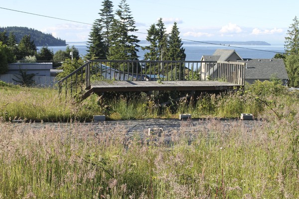 Today, steps lead up to a deck with no house. A sheet of Visqueen is laid over the house site. Utility pipes stick up out of the ground.