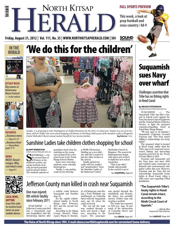 POULSBO — The Suquamish Tribe challenges the Navy’s assertion that the Tribe has no fishing rights in Hood Canal. Jefferson County man is eighth vehicle-related fatality in North Kitsap since February 2011. Sunshine Ladies take children clothes shopping for school.