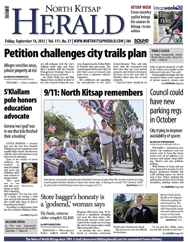 Inside the Herald you’ll find local news, Public Meetings, Opinion, Letters to the Editor, Sports & Outdoors, North Kitsap Calendar, coverage of North Kitsap’s 9/11 tributes, Police Calls, Obituaries, Anniversaries, Around Town, Political Notebook, Kitsap Week Life and Culture, Northwest Wines, Kitsap Week Sudoku, Kitsap Week Crossword, Kitsap Calendar, Around Kitsap, and Sound Classifieds & Real Estate Now.