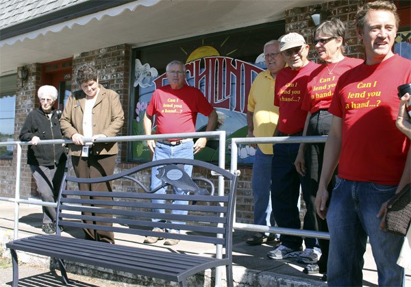POULSBO — Sporting T-shirts that read “Can I lend you a hand …?” the Poulsbo Lions gathered in front of North Kitsap Fishline to dedicate a bench to the late Garvin Tootle.