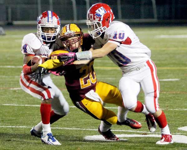 Kingston's Mikole Hendricks fights two Washington Patriots offensive linemen for the football during the Nov. 2 playoff game at North Kitsap Stadium. Kingston won 40-37 for a berth into the 2A State tournament.