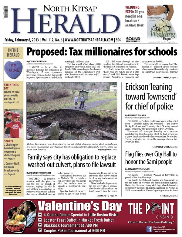 POULSBO — A bill proposes raising at least $167 million a year for public schools by imposing a 2 percent tax on millionaires. Poulsbo Mayor Becky Erickson says she is “leaning toward” hiring Port Orchard Police Chief Alan Townsend as the next chief of police. A Poulsbo family says the city has an obligation to replace a washed-out culvert that has cut off vehicle access to their property. The Sami flag flew over Poulsbo City Hall on Wednesday, honoring the indigenous people of northern Scandinavia and Russia’s Kola Peninsula.