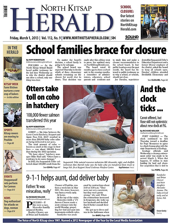 POULSBO — School families brace for closure. OPG president pessimistic about getting a new dock at Port Gamble. Otters take toll on hatchery coho. 9-1-1 helps aunt, dad deliver baby.