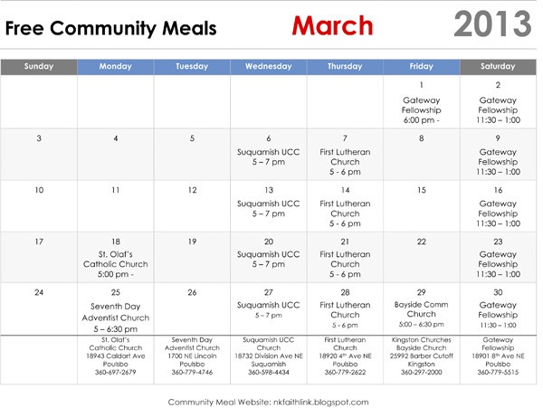 POULSBO — Free community meals are provided at the following locations each month. For more information, contact each location. In North Kitsap, www.NKFaithlink.blogspot.com. An online Resource Guide has a list of meals and other services available countywide.
